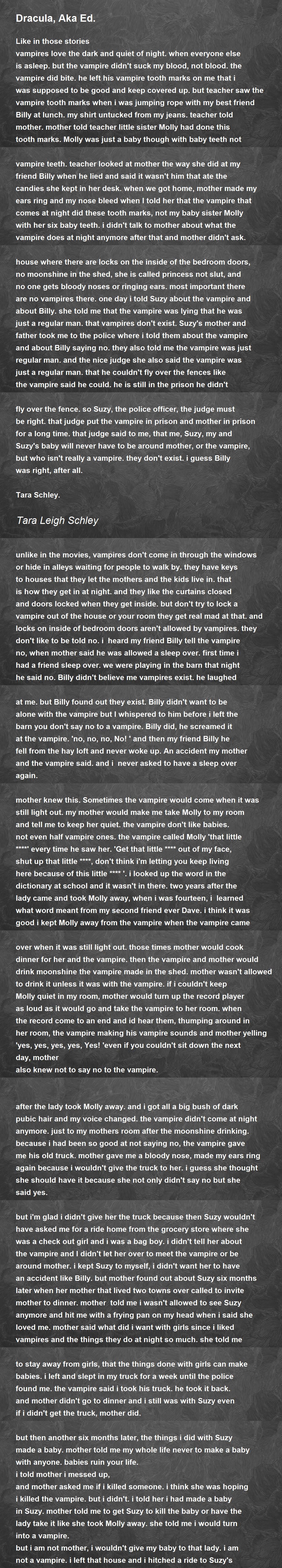 but i'm glad i didn't give her the truck because then Suzy wouldn't have asked me for a ride home from the grocery store where she was a check out girl and i was a bag boy. i didn't tell her about the vampire and I didn't let her over to meet the vampire or be around mother.i kept Suzy to myself, i didn't want her to have an accident like Billy. but mother found out about Suzy six months later when her mother that lived two towns over called to invite mother to dinner. mother told me i wasn't allowed to see Suzy anymore and hit me with a frying pan on my head when i said she loved me. mother said what did i want with girls since i liked vampires and the things they do at night so much. she told me to stay away from girls, that the things done with girls can make babies. i left and slept in my truck for a week until the police found me. the vampire said i took his truck. he took it back. and mother didn't go to dinner and i still was with Suzy even if i didn't get the truck, mother did.